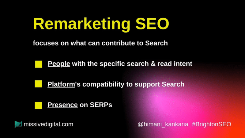 You need to think of “remarketing SEO” that focuses on what you can contribute to search, be it people, platforms, or SERP presence.