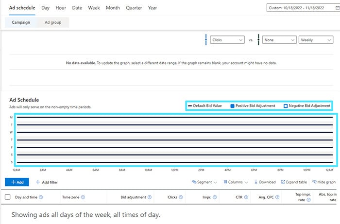 Ad schedule now with a calendar view. There is now a new calendar view in the ad scheduling section of the Microsoft Ads dashboard. This provides you with a clear overview of all the times when your ads will serve with your default bid (0% bid adjustment), a positive bid adjustment, a negative bid adjustment, and all the times when your campaigns will not deliver.