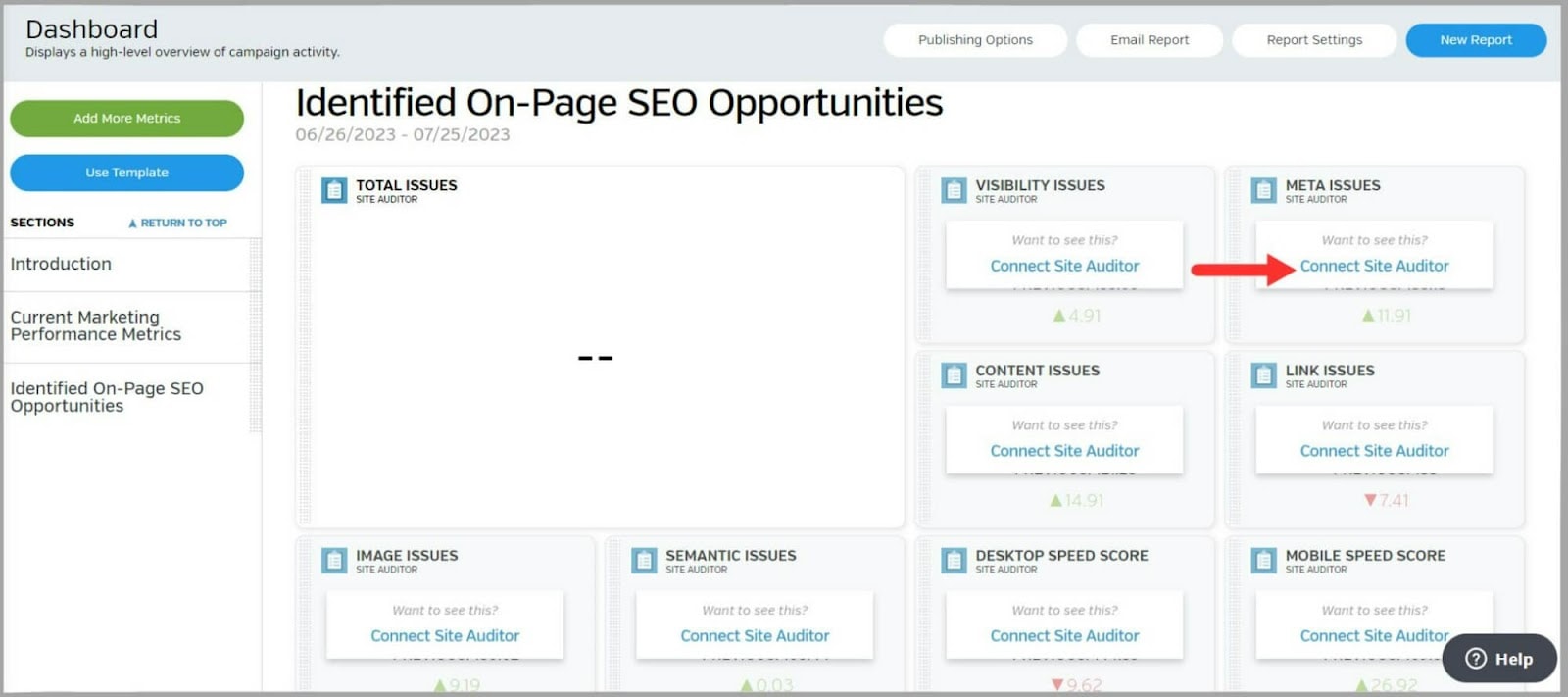 For example, say you wanted to view the data about “Meta Issues” on your site, you’ll need to click “Connect to Site Auditor” first.