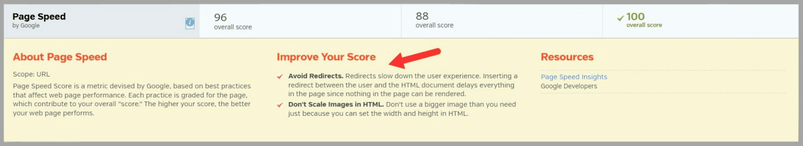 Here, I can see my site score out of 100 and issues relating to “Page Errors”, “Redirects”, and “Internal Broken Links.”