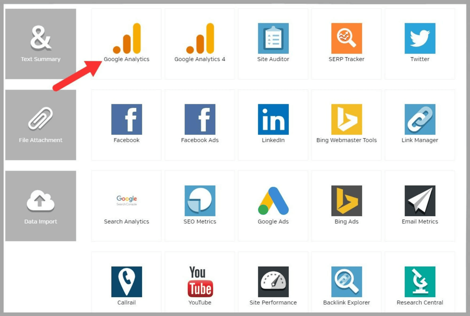 When you click on this, you can choose to add metrics from other platforms to your dashboard, for example, Google Analytics.