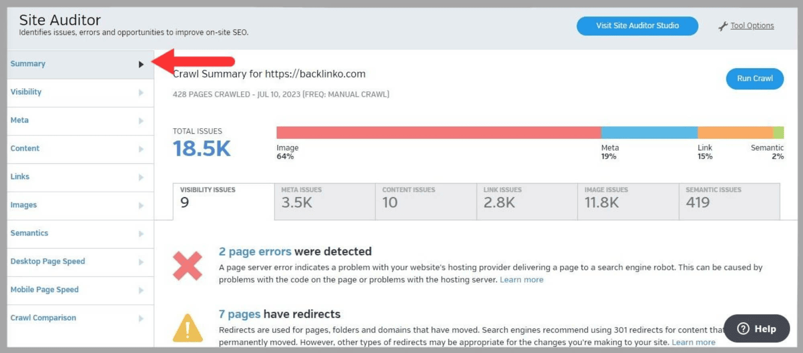 - Semrush’s Site Audit Tool is far more detailed than Raven Tools. It gives you data on vital metrics like crawlability and core web vitals.