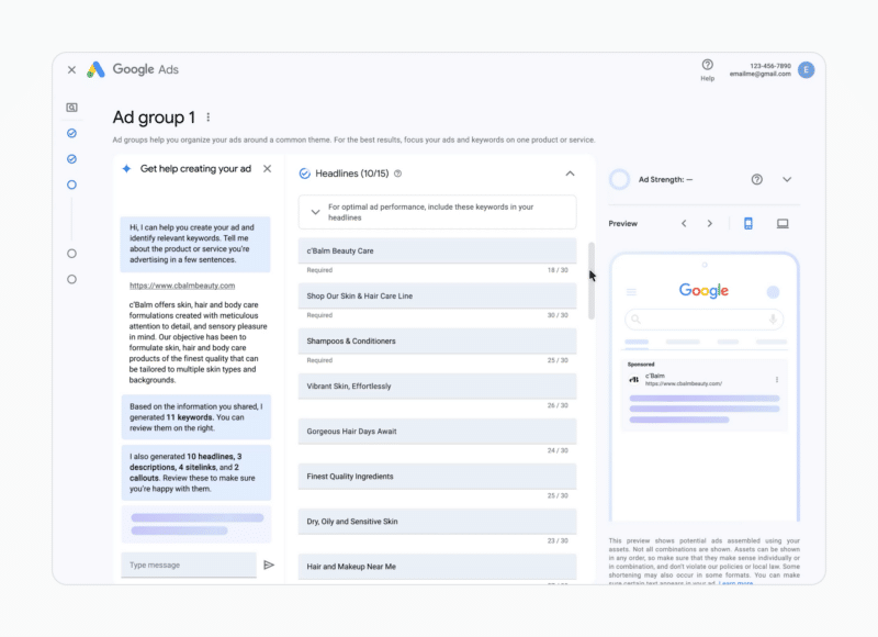 Users can also prompt Google Ads AI for more specific detail on those assets. For example, a prompt for a beauty brand could include asking for anti-aging copy: