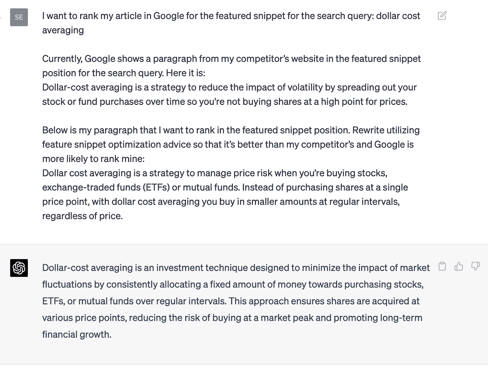 You’ll want to prime ChatGPT with how to optimize for featured snippets so that it has this context in your chat to help optimize for yours.