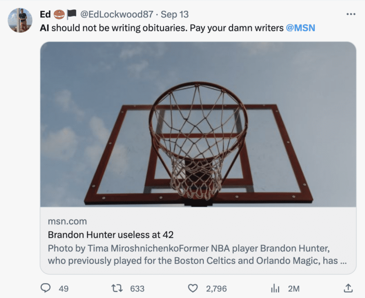 Microsoft has been criticised after publishing an AI-generated obituary for NBA star Brandon Hunter.