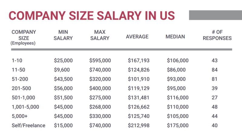 Company size. The survey also looked at salaries by company size. If you’re looking to get a six-figure salary, your best chances will be working at a company with 1-10 employees.