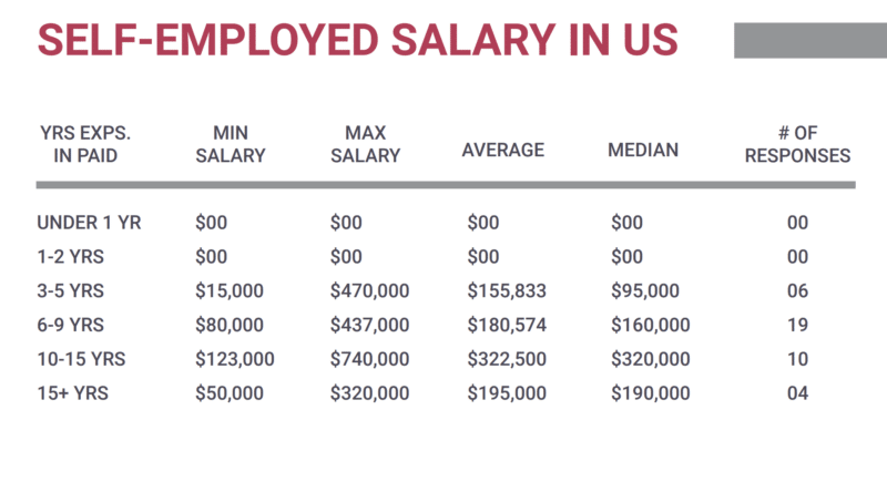 Self-employed. The median salary for self-employed people is $155,833 for those with 3-5 years of experience. The highest compensation for this category occurred in those with 10-15 years of experience, coming in at $322,500.