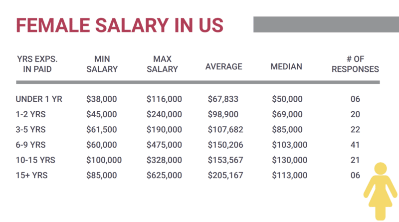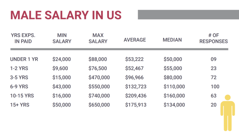 Male vs. female. In a shocking twist, females with 9 years of experience or less were paid more than their male counterparts. However, for those who have 10 years or more of experience, males earn more on average.