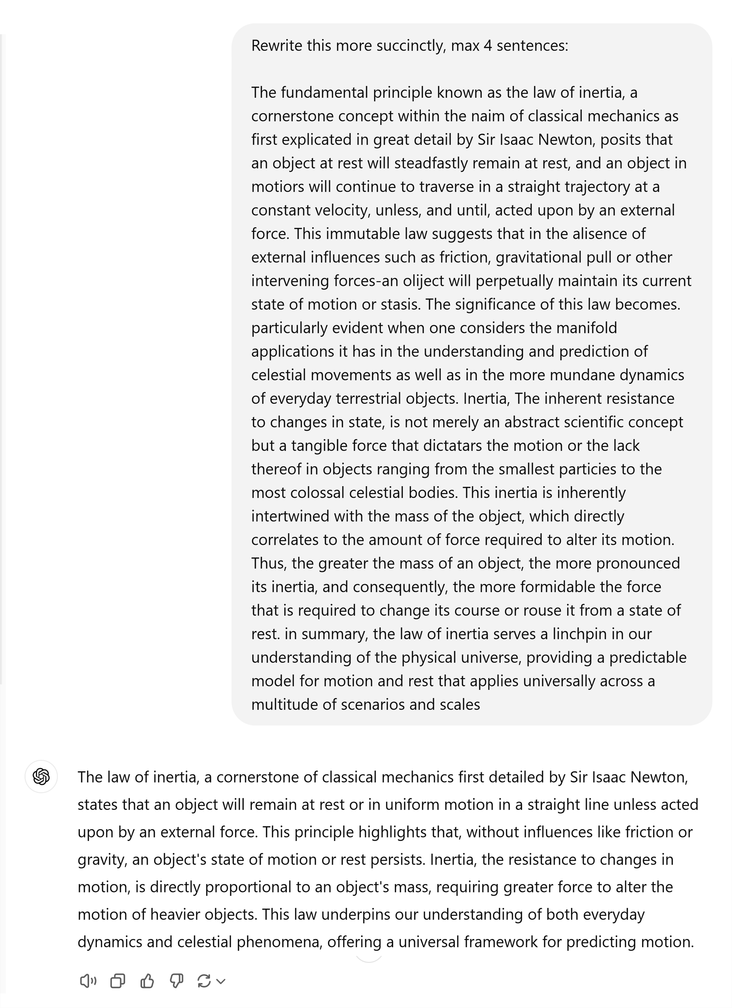 Here’s an example prompt using ChatGPT to tighten up a very wordy explanation of the law of inertia.