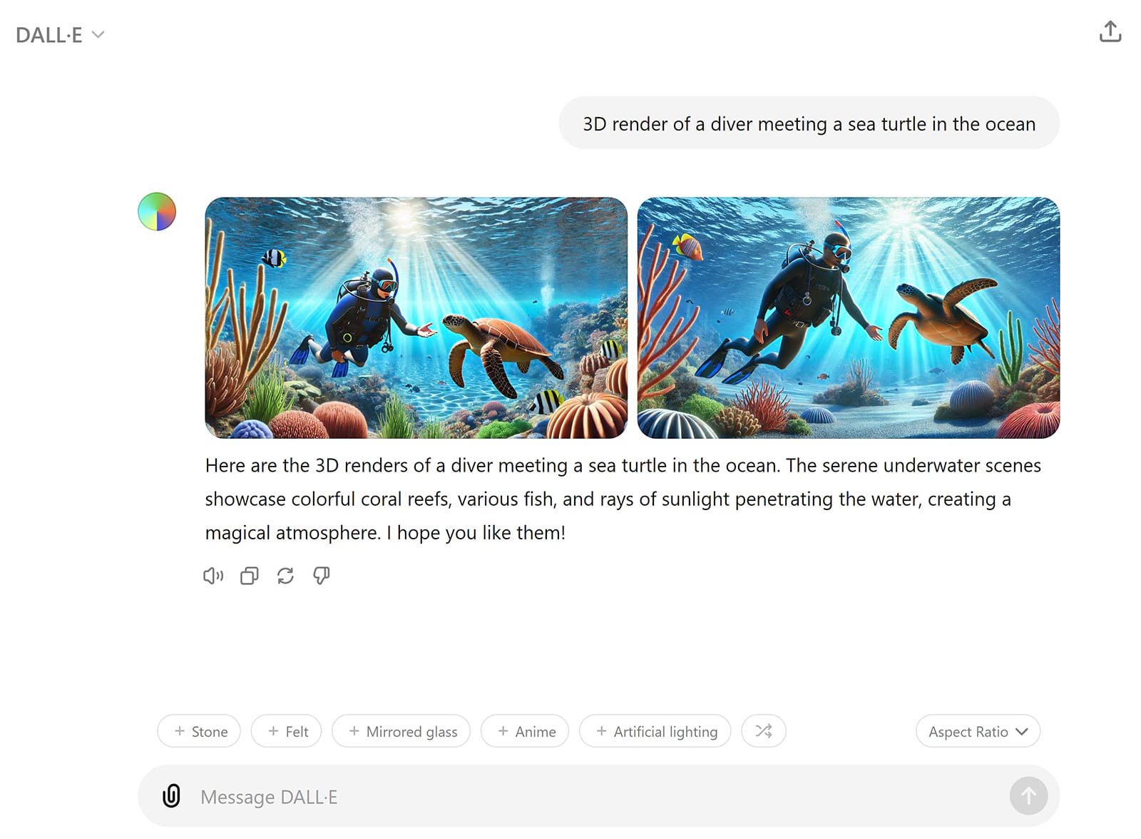 The more specific and detailed your prompt, the more likely the image will meet your needs.