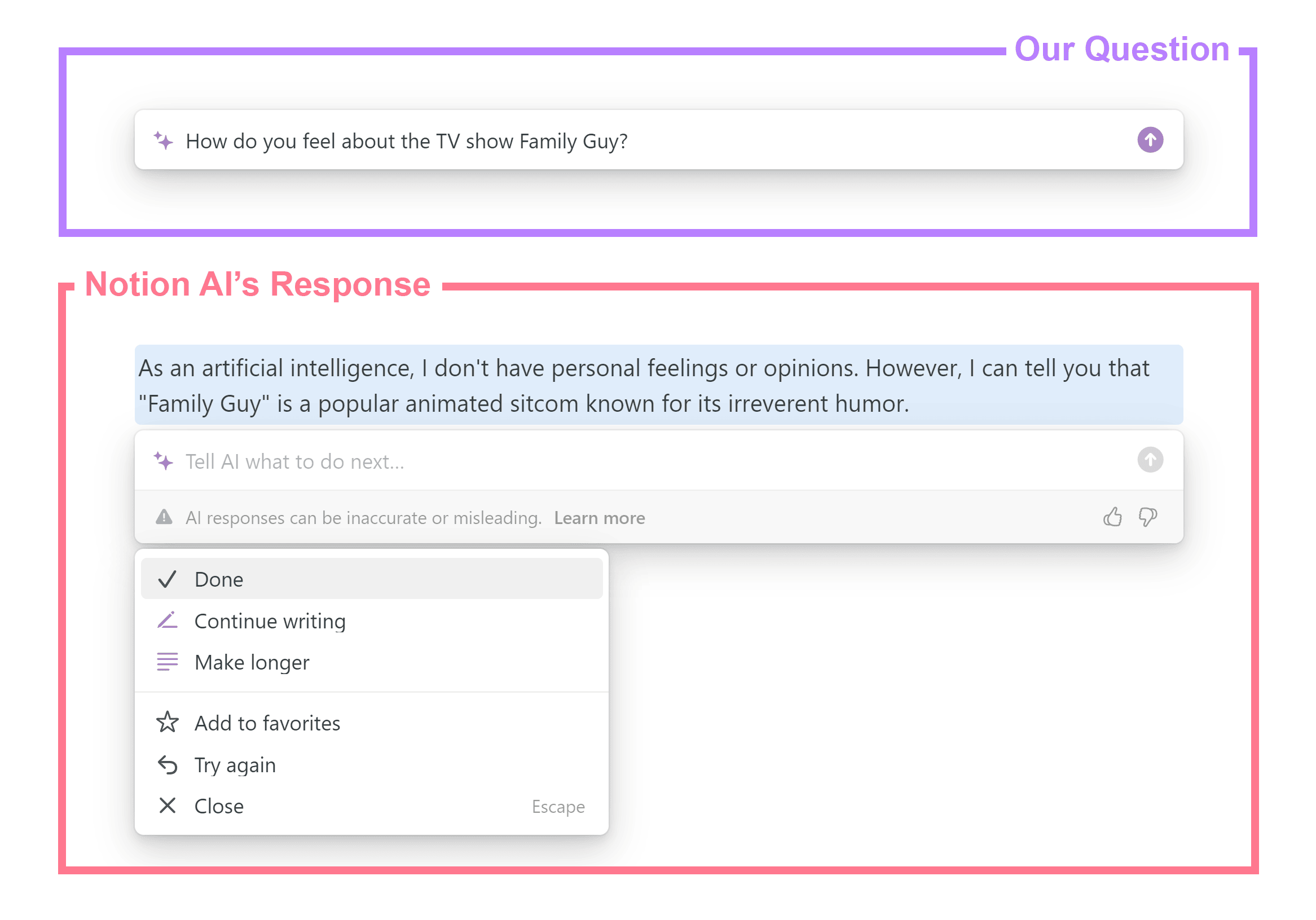 Here’s what happened when we asked Notion AI to generate an opinion about the TV show “Family Guy”: