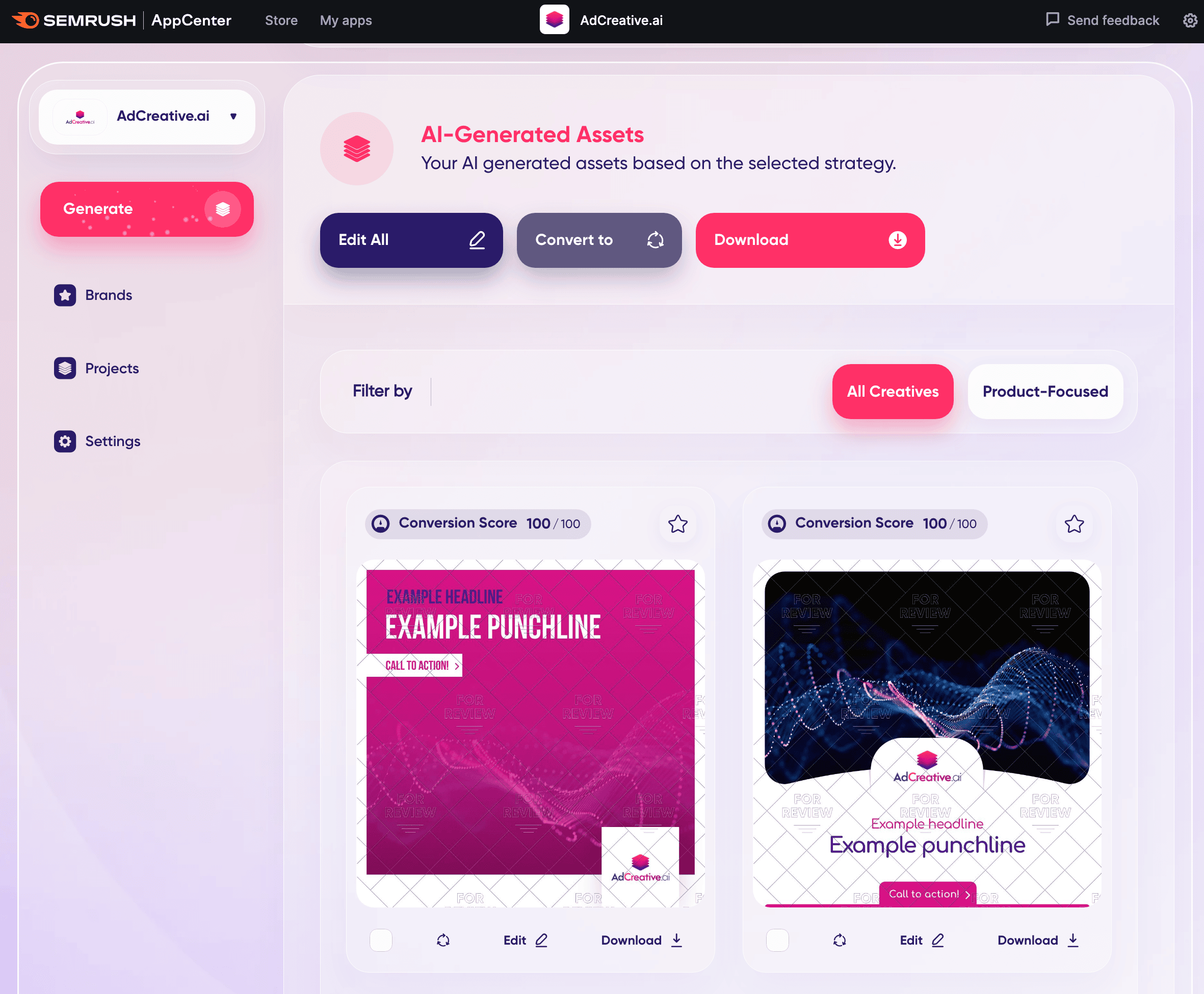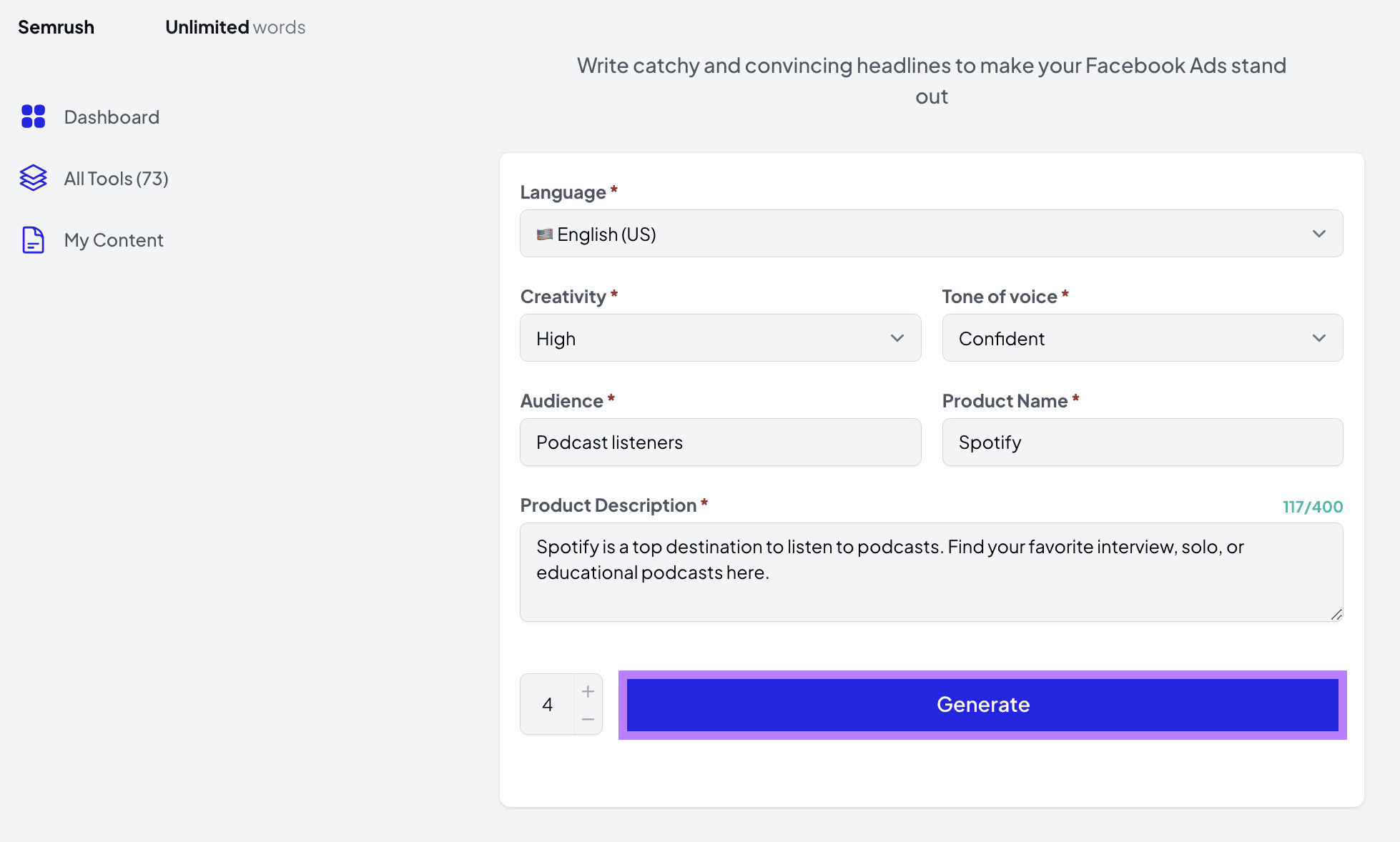 For example, Semrush’s Ecommerce Booster app generates ad descriptions based on keywords, text length, readability, tone of voice, and format settings.