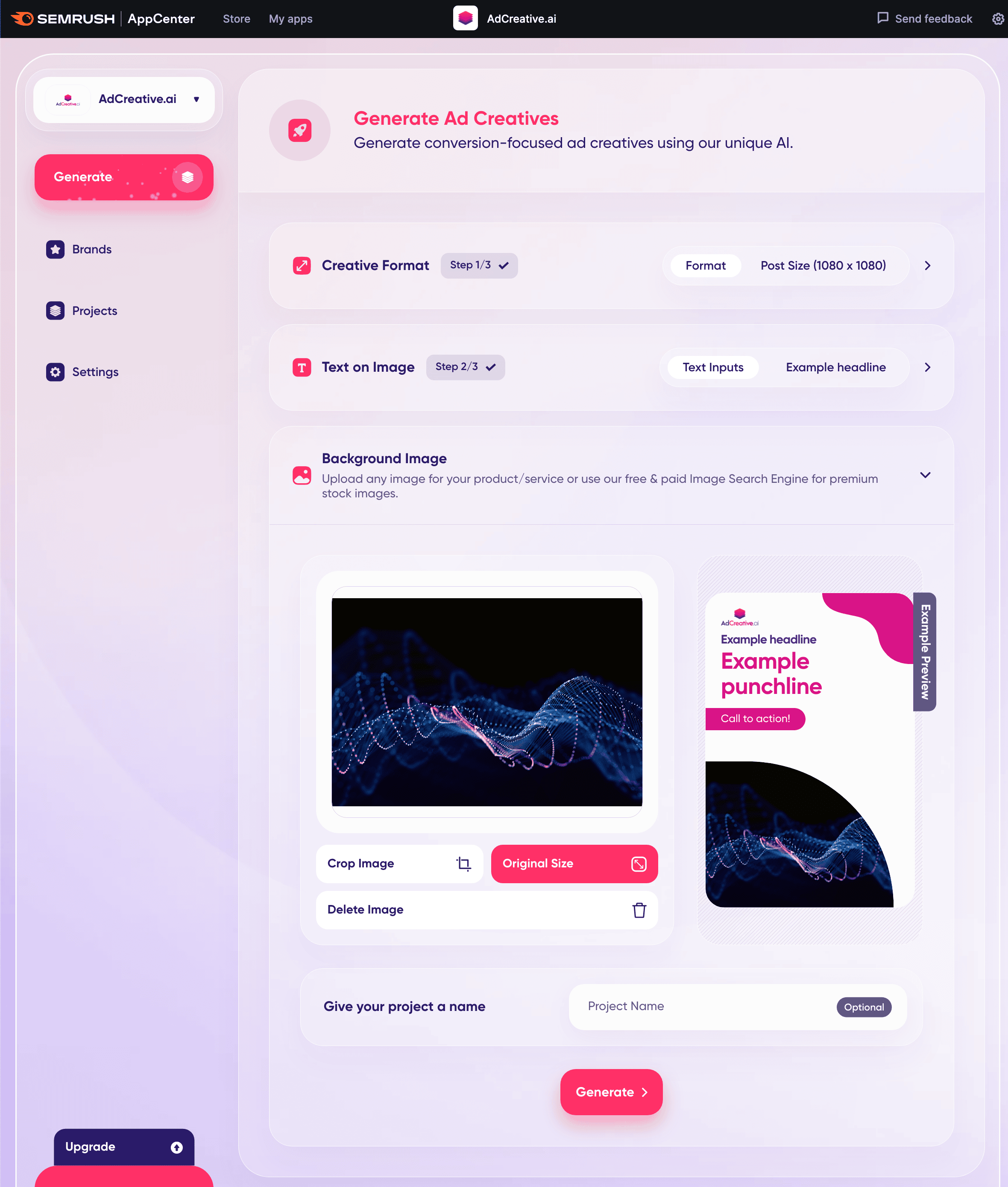 Upload a background image, crop it if necessary, and enter a project name (optional).