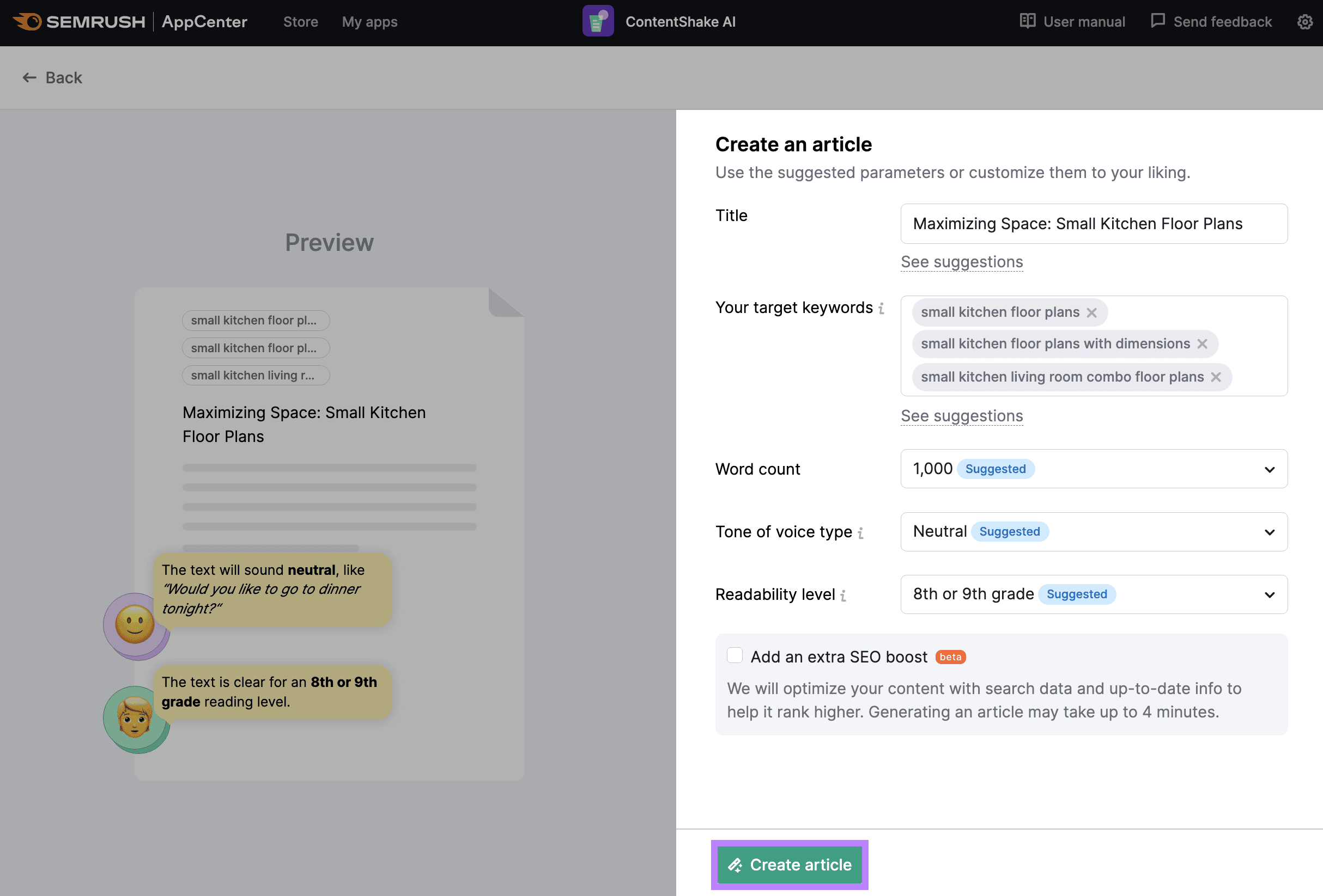 Review the suggested title, target keywords, word count, tone of voice, and readability level.
