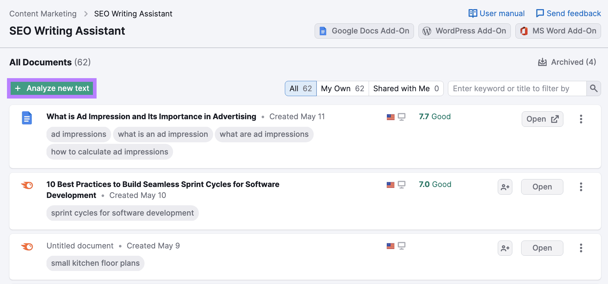 Head to the tool and click the “+ Analyze new text” button on the tool dashboard.