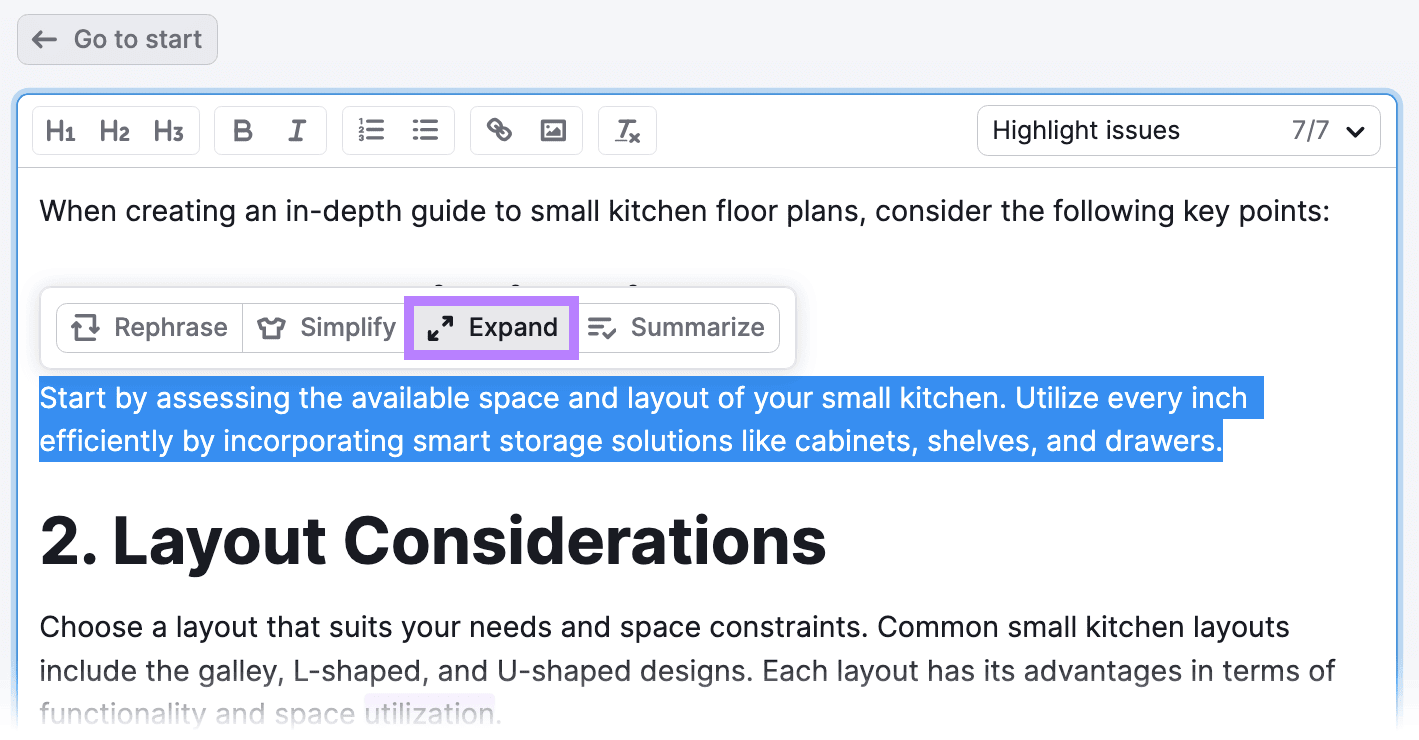 Select any phrase, sentence, or paragraph and click “Expand” to elaborate on those sections.