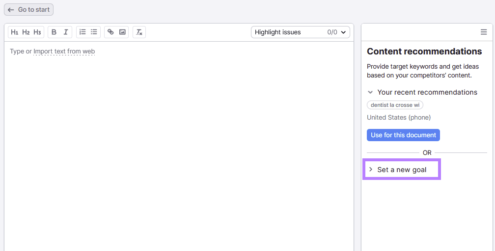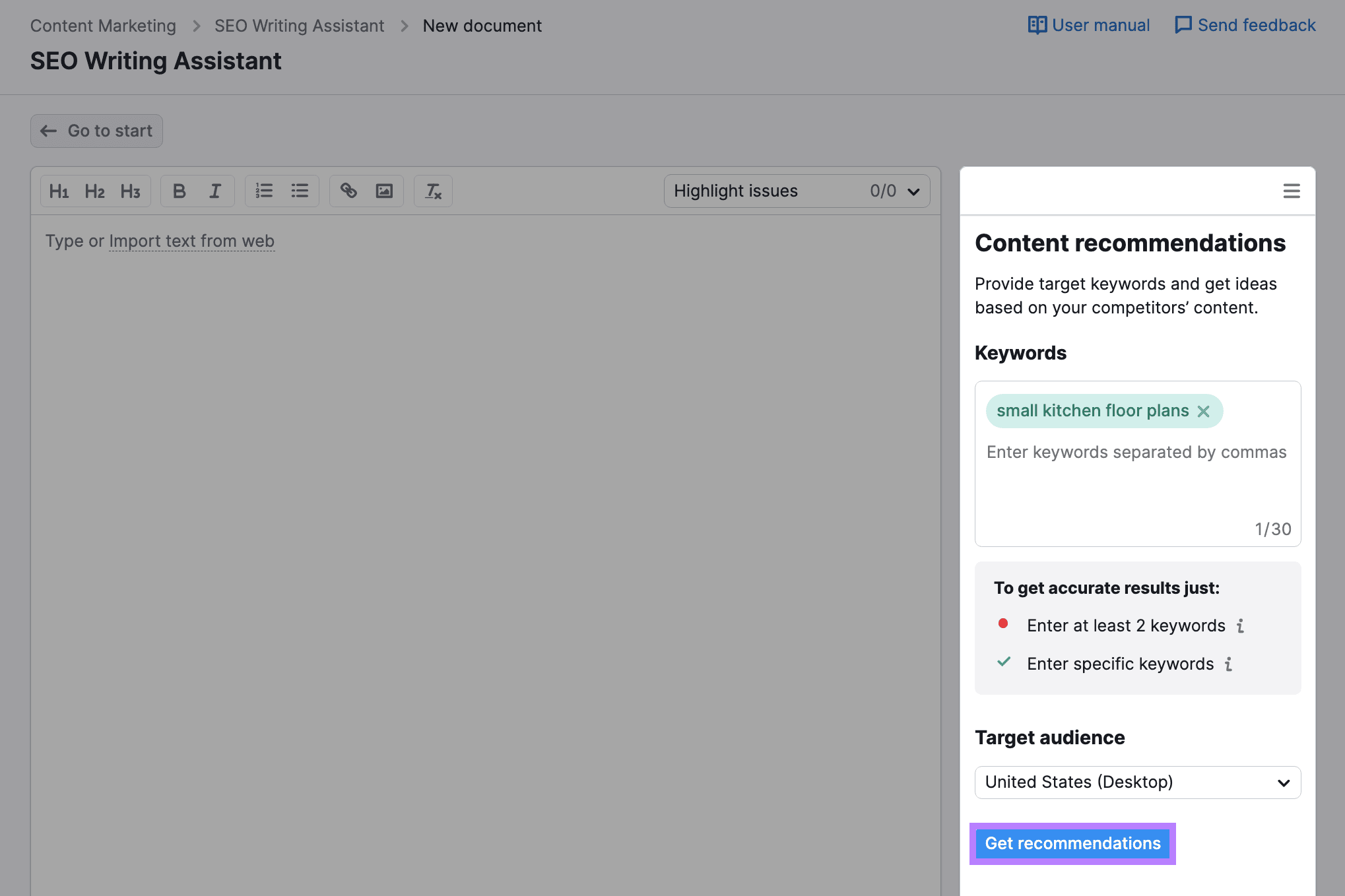 If you’re using this tool for the first time, input the keyword you intend to target and click “Get recommendations.”